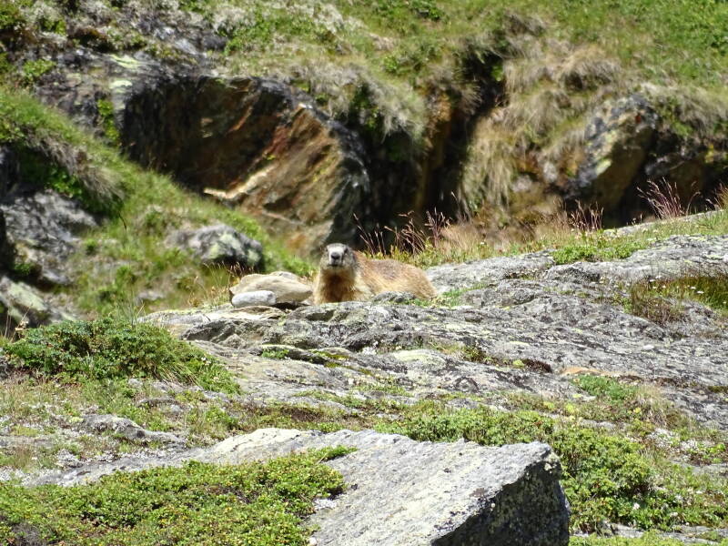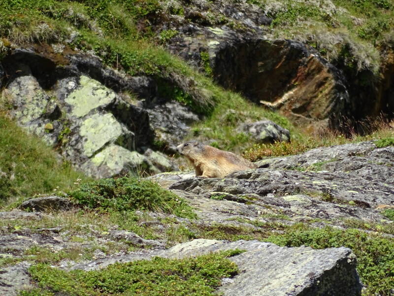 Het heeft wat geduurd, maar op reis nummer drie is het toch prijs : onze eerste marmot gezien ! Met dank aan de oude wandelaar, want zoals je ziet gaat zo'n diertje volledig op in zijn omgeving ...Tevreden zetten we de afdaling verder.