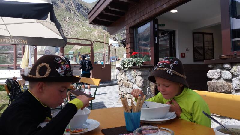 Het is ondertussen bewolkt geworden, en op deze hoogte is het toch wel fris en winderig. We doen onze truien aan, en genieten van een lekker bord 'Nudelsuppe'  in de berghut.