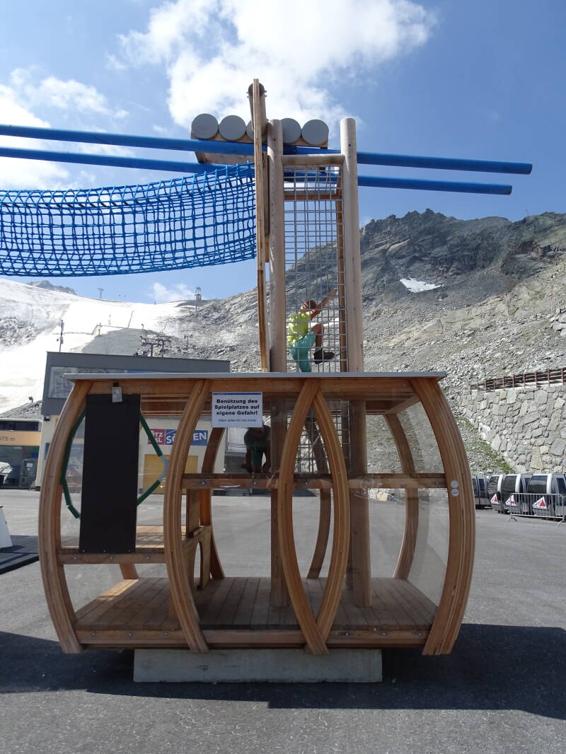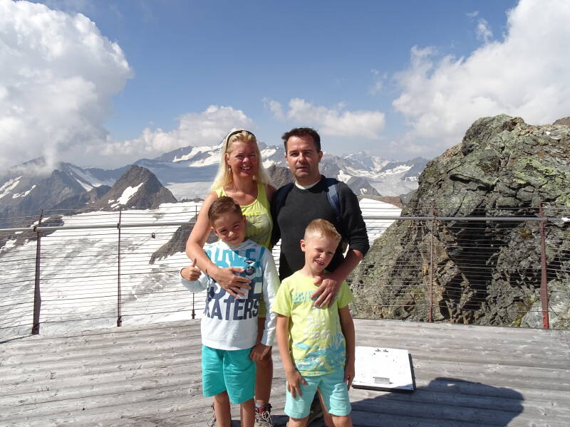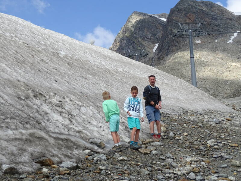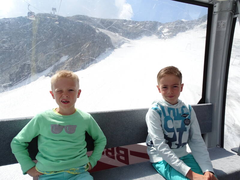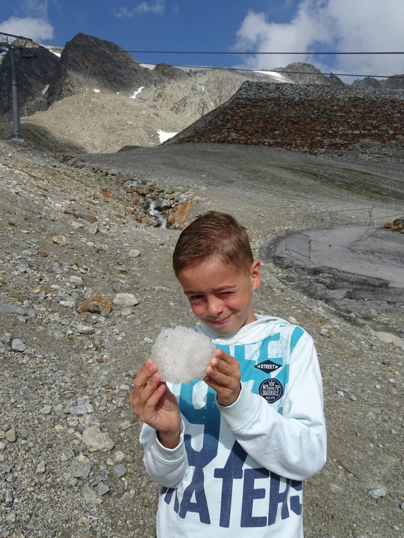 Maar er komt nog meer ! We nemen de 'Schwarze Schneidbahn II' die ons naar een hoogte van 3250 meter brengt, het hoogste berstation in het 'Ötztal'. We 'bergbahnen' simpelweg over de 'Rettenbachferner', wat zonder meer imposant is. Ilona, Tristan en Odin kijken hun ogen uit. Overal waar je kijkt is er sneeuw, bergroten, pieken, ijs en gletschers. Bjorn ondertussen besterft het in het zijn ogen veel te gammele 'bakje' maar is toch ook zeer onder de indruk van al de bergpracht.