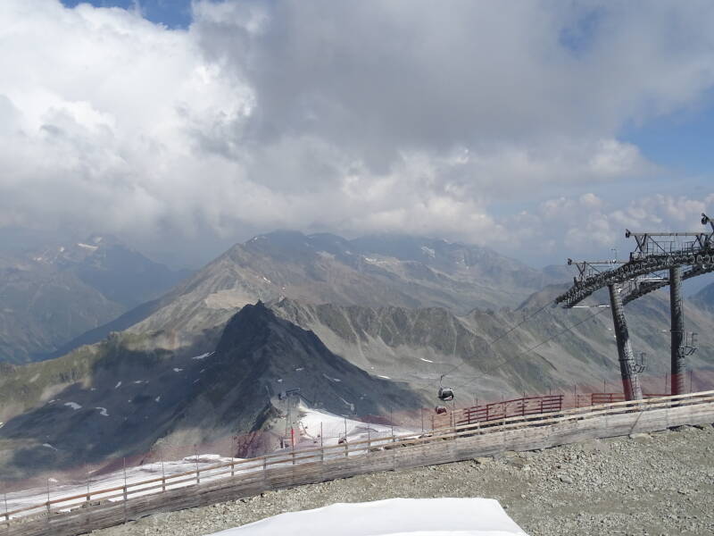Wat volgt is een ware belevenis. De 'Schwarze Schneidbahn I' brengt ons naar de 'Rettenbachjoch' op 2990 meter langs rotsen en de onderkant van de gletscher. Daar hebben we een prachtig zicht op de 'Rettenbachferner' en de toppen van de 'Ötztaler Alpen', maar ook op de sneeuwbergen en gletschers van het 'Pitztal'.