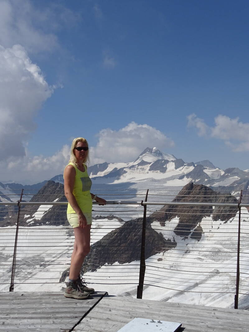 Na een kwartiertje flink omhoog komen we aan bij dat 'iets'. Het is het uitkijkpunt 'Naturplatform Schwarze Schneid' gelegen op 3309 meter. Van hieruit hebben we nog maar eens uitzicht op alle omringende bergen, maar ook op de 'Wildspitze' (3774m), de hoogste berg van Tirol en de derde hoogste berg van Oostenrijk. De foto's spreken voor zich ...