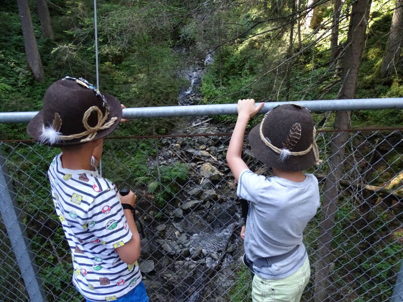 De verhalen zijn leuk en allemaal verbonden aan specifieke plaatsen in het Ötztal. We klimmen goed omhoog, en hebben algauw een mooi zicht op de omgeving.
