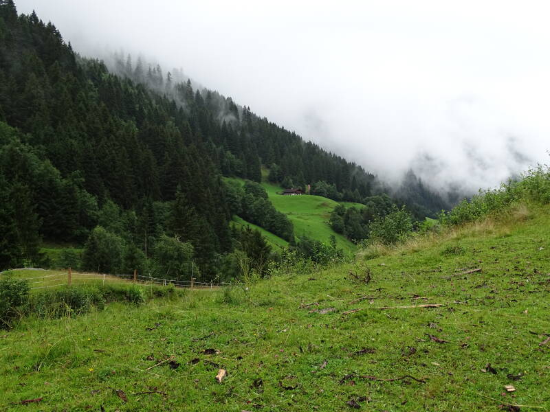 Vanop onze parkeerplaats zien we de Alm al liggen, aan de bosrand waar de mist uit opstijgt.