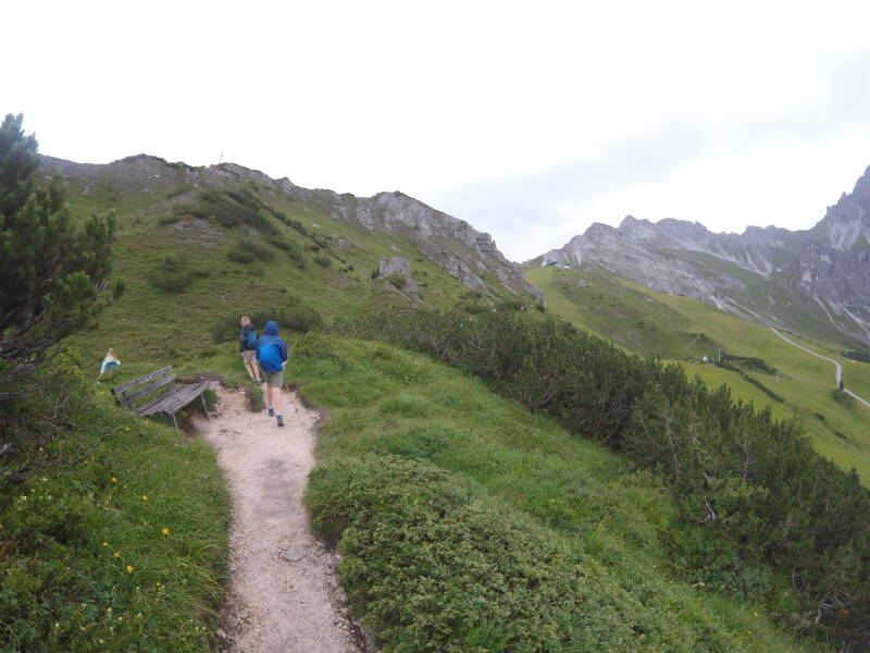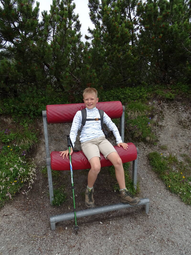 We stoppen niet, want we gaan onmiddellijk door naar het eerste grote doel van deze wandeling, de naturschauplatz 'Gletscherblick'. Dit is weer een kort stukje omhoog, met tamelijke steile hellingen aan de linkerkant. Bjorn doet nogmaals een inspanning ...