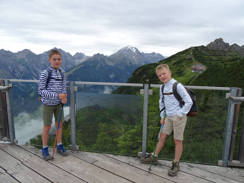 Aan het begin van de klim naar de naturschauplatz toont Odin nog eens waar we eerst zijn langsgekomen, en waar we hebben gestaan bij de 'Gletscherblick'.