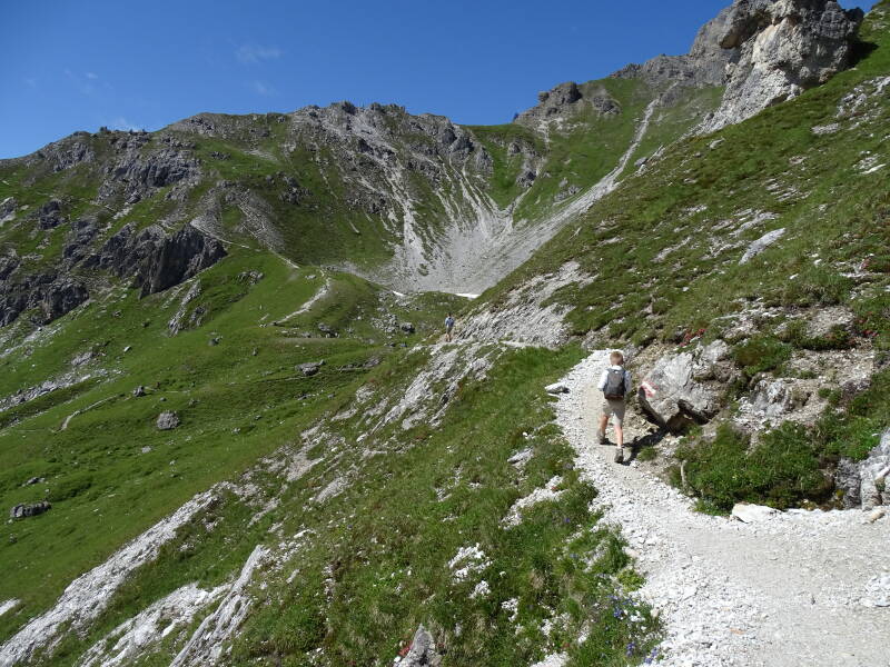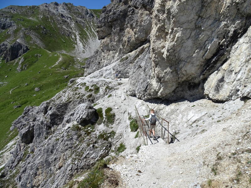 Een stukje boven de 'Senjochhütte' gaat het pad verder naar de top van de 'Kleine Burgstall'. Dit nemen wij niet, we nemen het pad die min of meer op en neer loopt onder deze top. Hier begint het pad waar Bjorn voor vreesde : tussen en over rotsen, met afgronden aan de linkerkant ... Er zijn echter veel wandelaars, en zelfs kleine kinderen nemen het pad. Gestresst begint Bjorn er aan ...