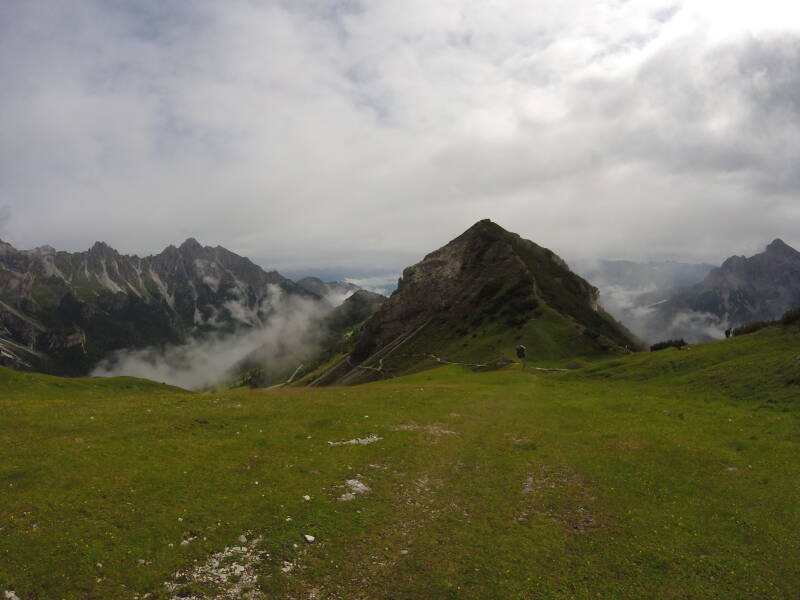 Het pad loopt op neer langs de almweides. Het begint lichtjes te spetteren, zodat we onze regenvestjes al aan doen.