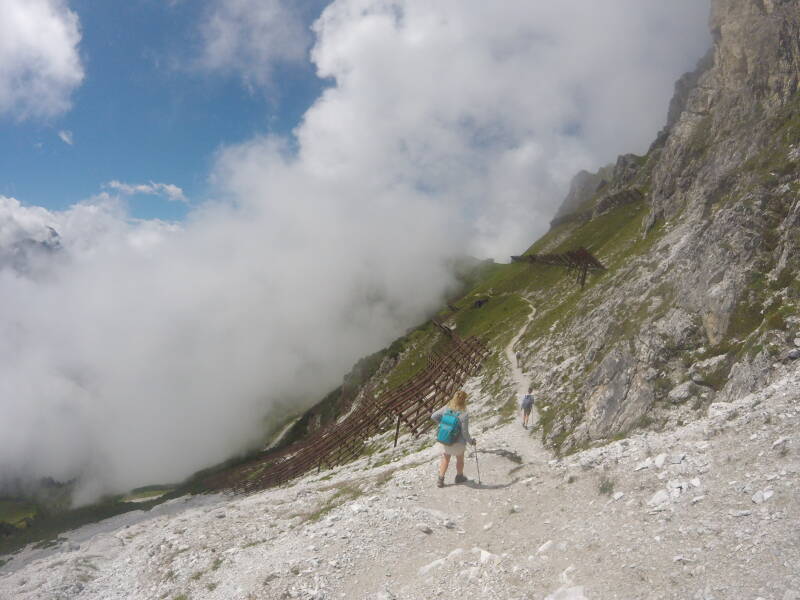 Nog een stuk verder komen we bij ijzeren lawinebarrières, waar we ook tussen moeten of mogen wandelen.
