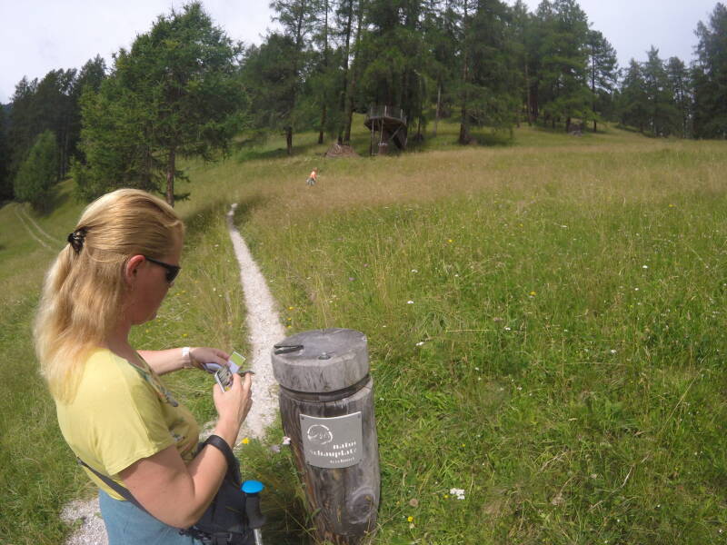 Normaal gezien zouden we nu terugkeren naar het dalstation, maar ... Ilona heeft gezien dat er met het verzamelen van de stempels van de 'Naturschauplätze' er een T-shirt kan bekomen worden ... We zullen dus proberen om tijdens onze reis 5 van deze 'natuurplaatsen' te bezoeken om deze beloning te krijgen! Iets verder dan de alm ligt er één, dus wandelen we een stukje verder ...