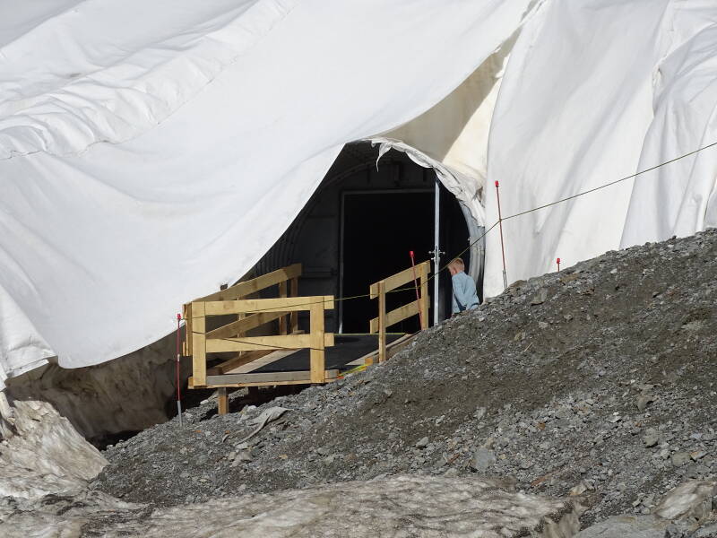Na een tiental minuutjes komen we bij de ingang van de ijsgrot. Deze ligt eigenlijk onder de gletscher, die met witte zeilen is afgedekt tegen de zon en warmte (gebeurt bij vele gletschers in de zomer). We krijgen korting met onze 'Stubaital Sommer Card' !