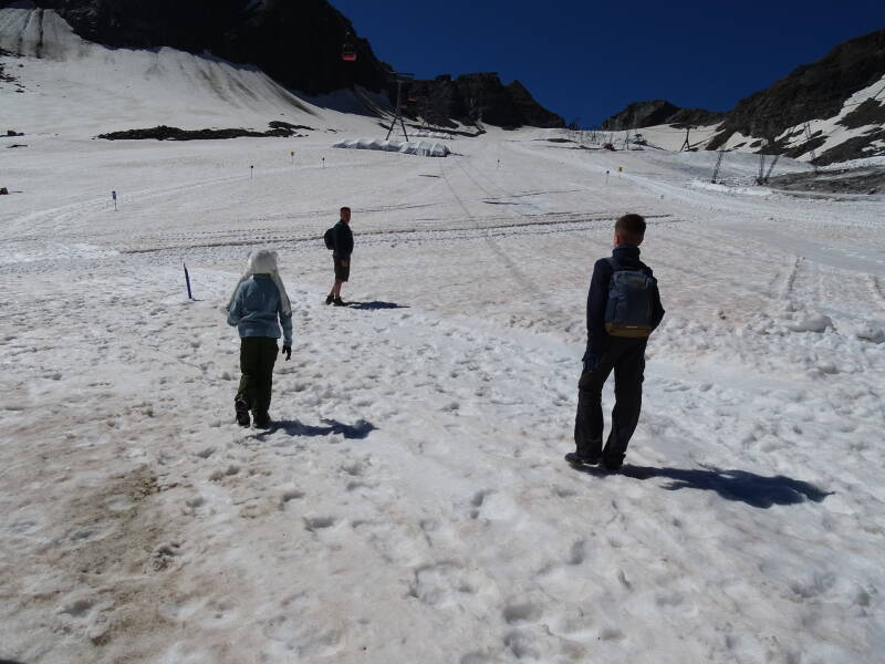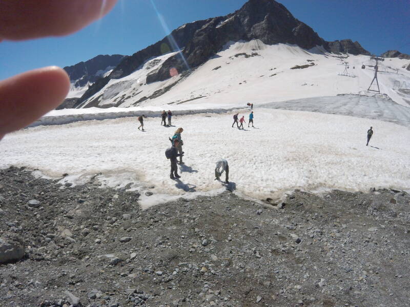 Je kan ook over de gletsjer zelf omhoog wandelen. Een 'hardcore' wandelaar - in korte broek - stapt dapper door de sneeuw omhoog !