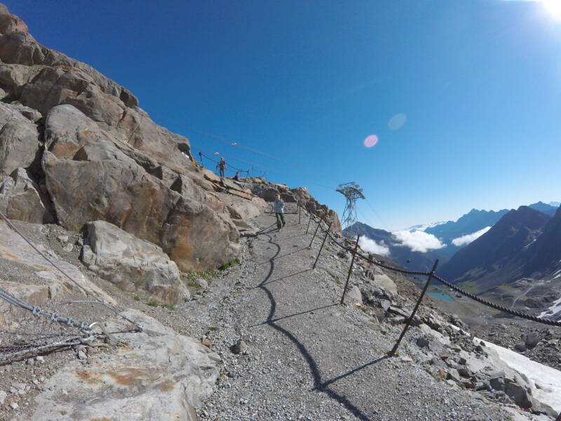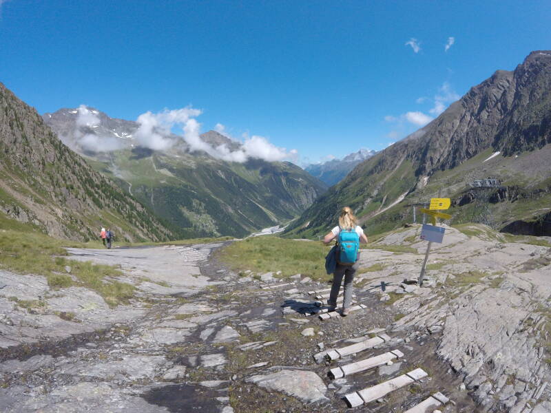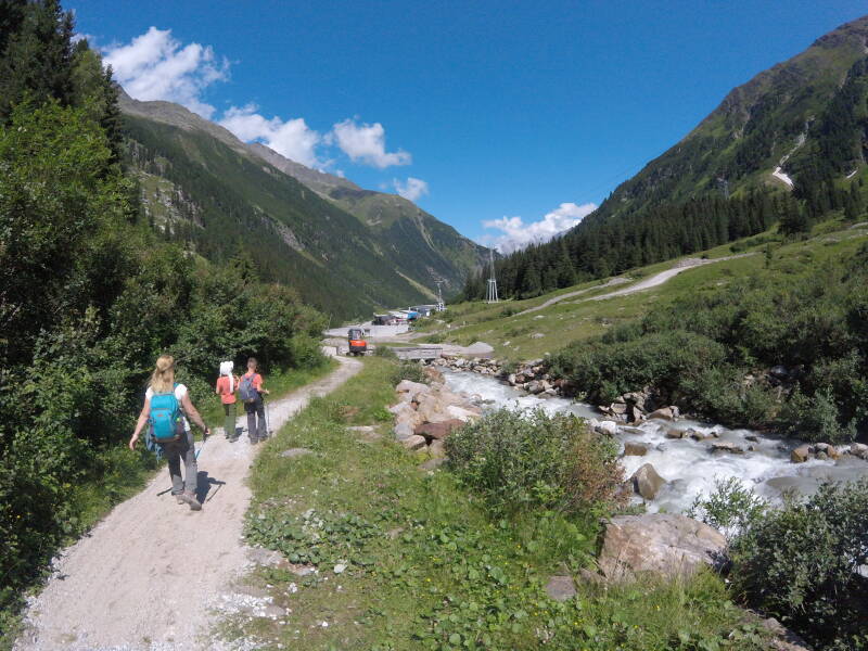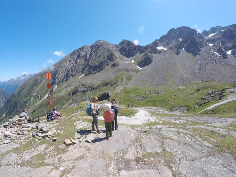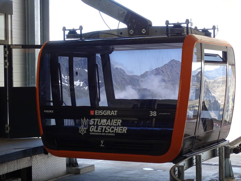 We rijden tot op het einde van het dal, bij het gehucht 'Mutterberg'. Hier staan enkele hotels, en is het dalstation van de 'Eisgratbahn', die ons in drie etappes naar de gletscher gaat brengen.