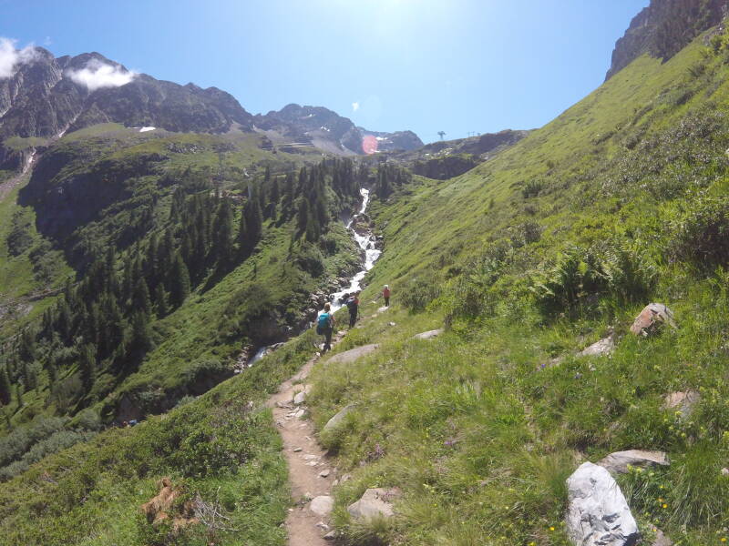 Na een tijdje lopen we in de grasweiden langs een rivier. We horen een schril gepiep, maar de 'Murmeltiere' zien we helaas niet ...