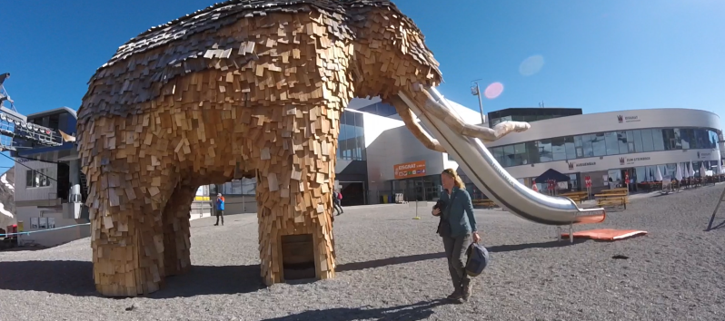 We komen aan bij het bergstation 'Eisgrat' ! Als we het gebouw uitlopen hebben we zicht op de gletscher, en worden we begroet door een reuzegrote mamoet !