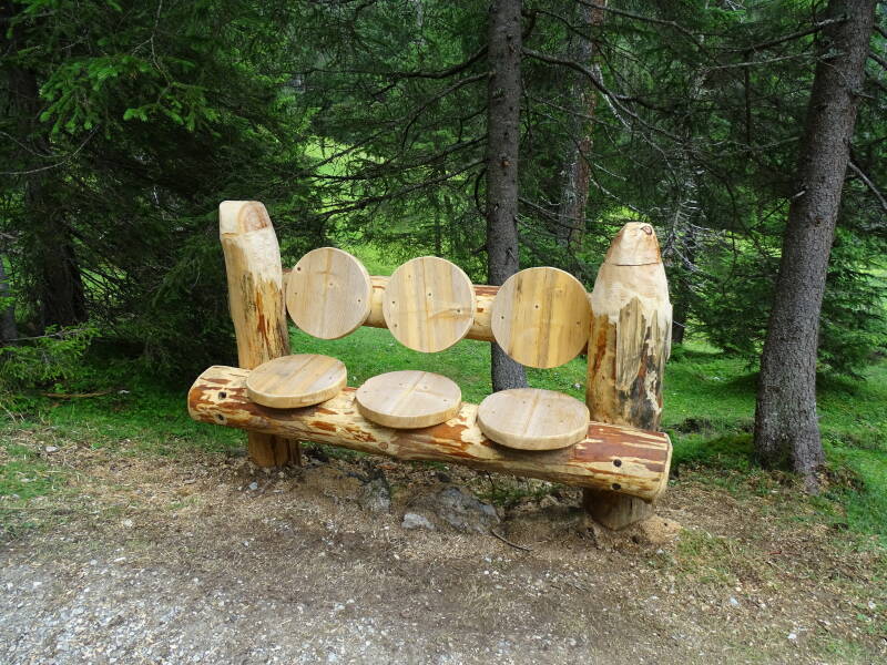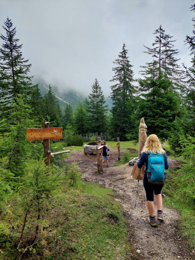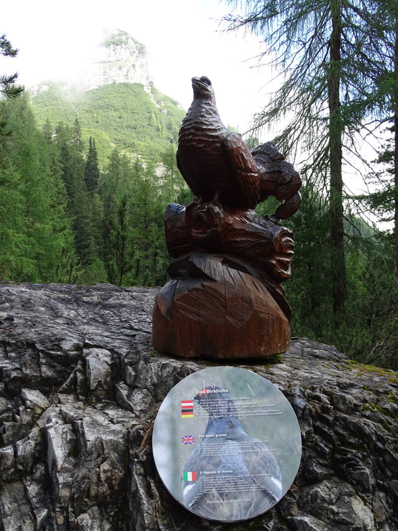En we komen ook de eerste van vele houten dierenbeelden tegen, die langs het pad staan opgesteld met uitleg over de alpendieren.