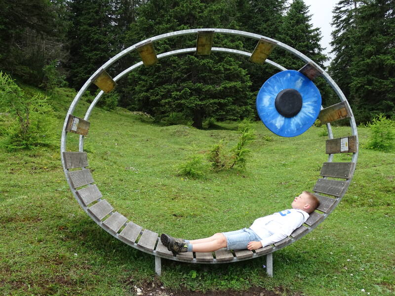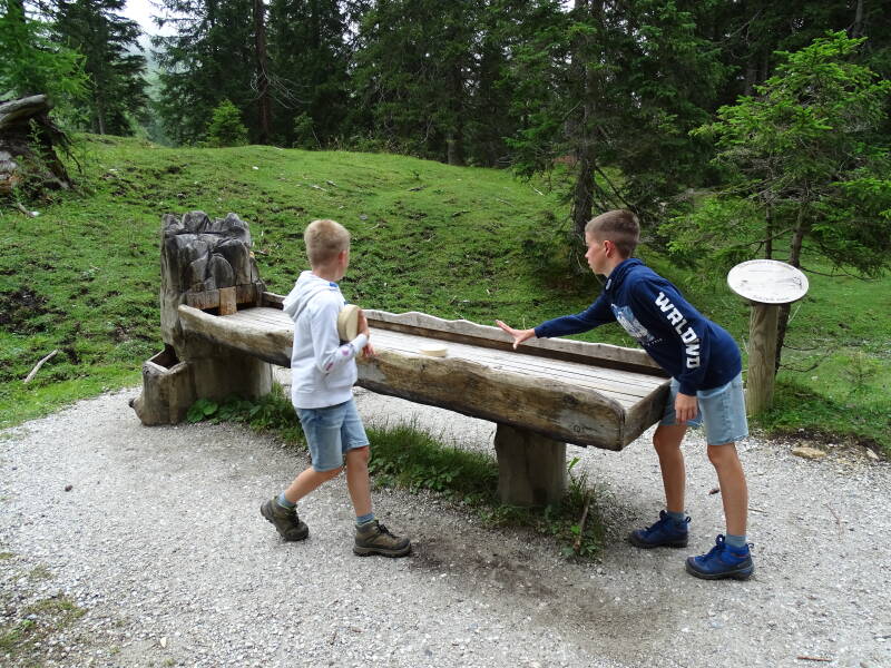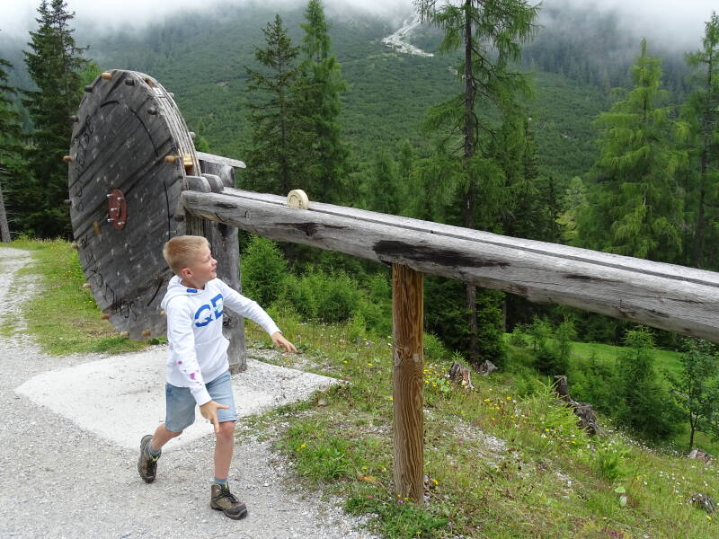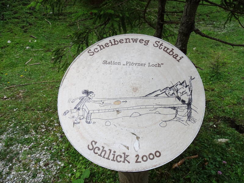 We besluiten om toch iets te gaan doen deze morgen, en gaan naar de kabelbaan 'Schlick 2000' om daar een natuurpad te wandelen, alsook om de 'schijvenweg' te gaan lopen. Hiertoe huren we twee 'Scheiben', het is te zeggen twee houten schijven om later te gebruiken ...