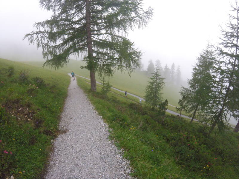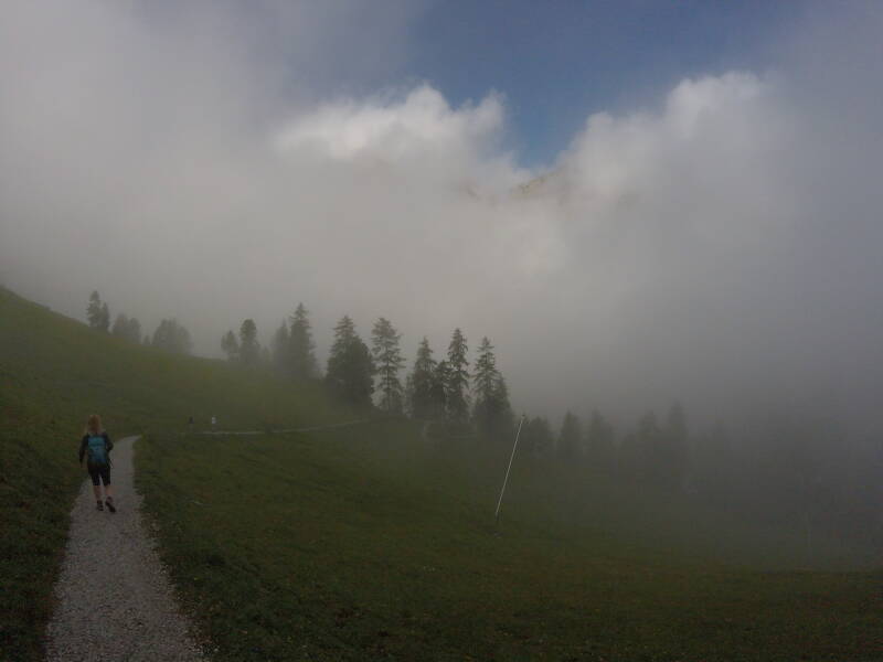 We gaan voorbij de alm, nog steeds naar beneden, verder de mist in.