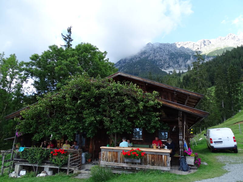 We begeven ons naar de 'HinterschieBingalm'. Het is er zeer druk gezien het zondag is, en er heel veel lokale bewoners ('Einheimische') op pad zijn vandaag. Zodoende is er heel veel volk op het terras, maar we vinden een prachtig plaatsje onder een 'Marillenbaum' ...