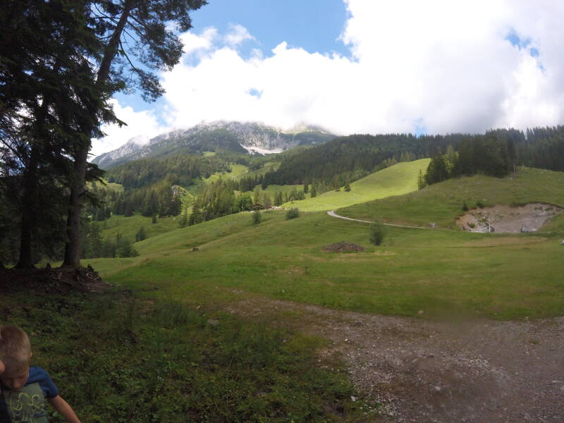 We komen het bos uit, in een open stuk waar de machtige 'Wilder Kaiser' in al zijn pracht opdoemt ...