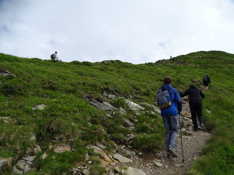 Het is tamelijk druk op de top van de 'Wildkogel' want deze is tamelijk eenvoudig te bereiken, en we wandelen verder, nu afdalend over de bergkam, waarbij we voortdurend de 'GroBe Rettenstein' voor ons in zicht hebben.