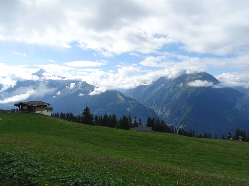 Bij aankomst op het middelstation staan we bovenop de hoge 'Gschosswand', en hebben we al een mooi zicht op de omringende bergen van het Zillertal. Het is jammer genoeg bewolkt, waarbij de vele toppen zich verstoppen achter de wolken …