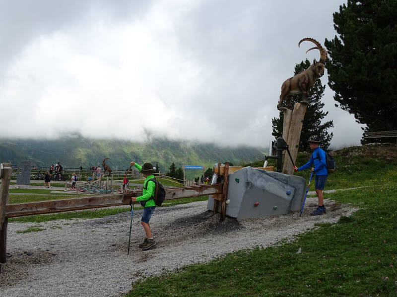 Eenmaal aangekomen op de top van de 'Kombibahn Penken' is het nogal fris, en tamelijk bewolkt. We kijken eens welke route we gaan nemen om de 'Panoramarundweg' te wandelen.