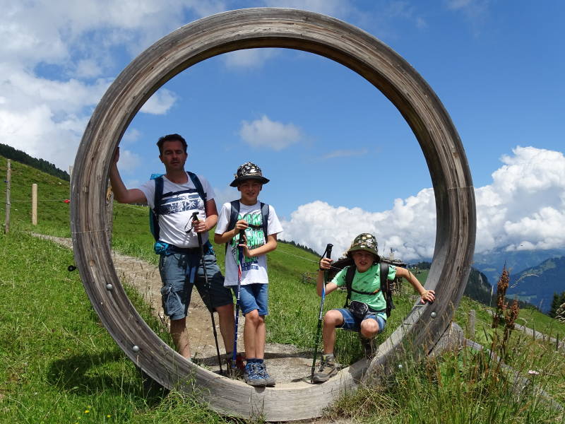 We halen verschillende stempels in de almen die rond 'Pepi's Kinderland' liggen. Ook is het ondertussen middag, en rusten we uit op een boomstronk om te eten.